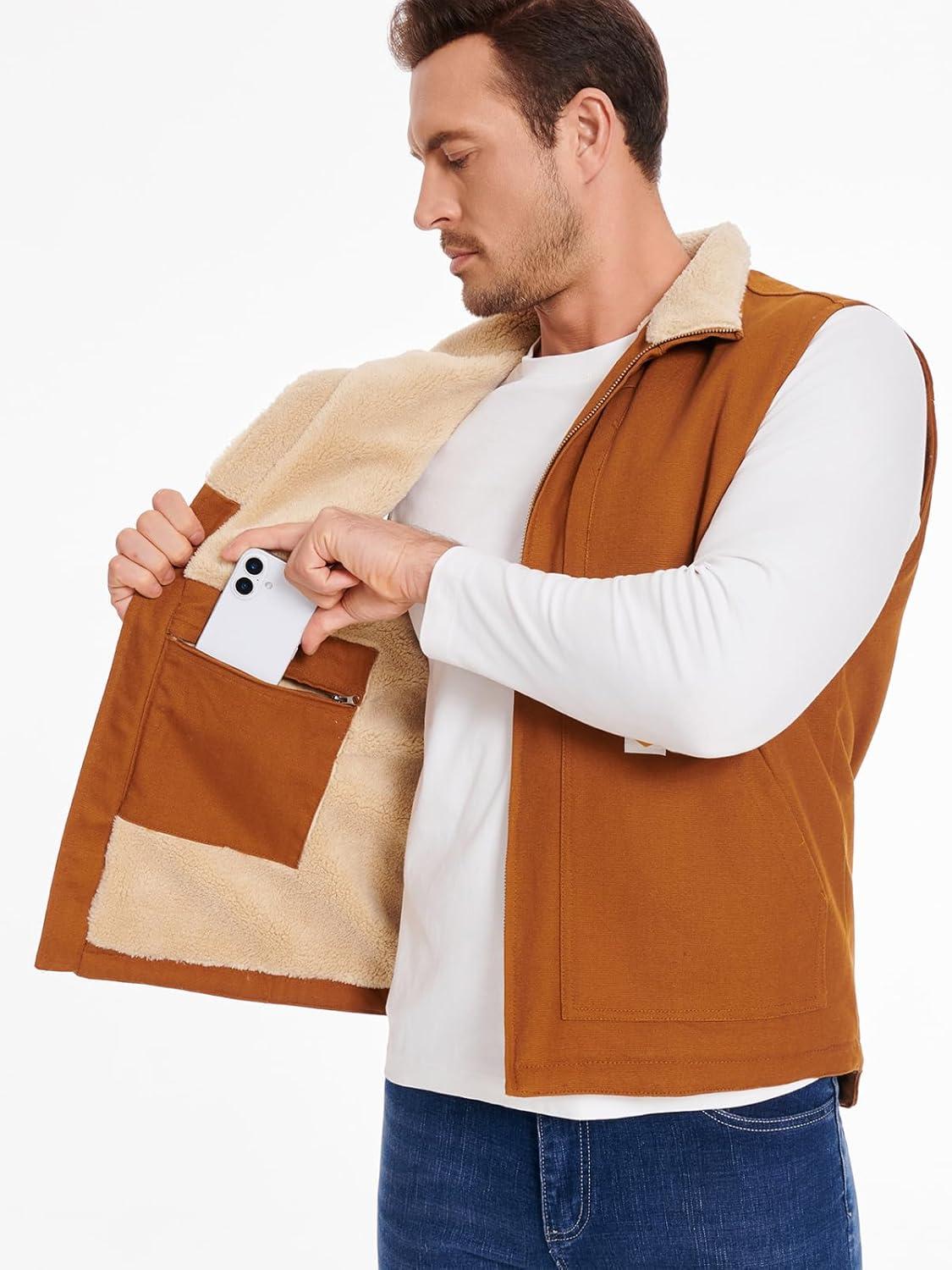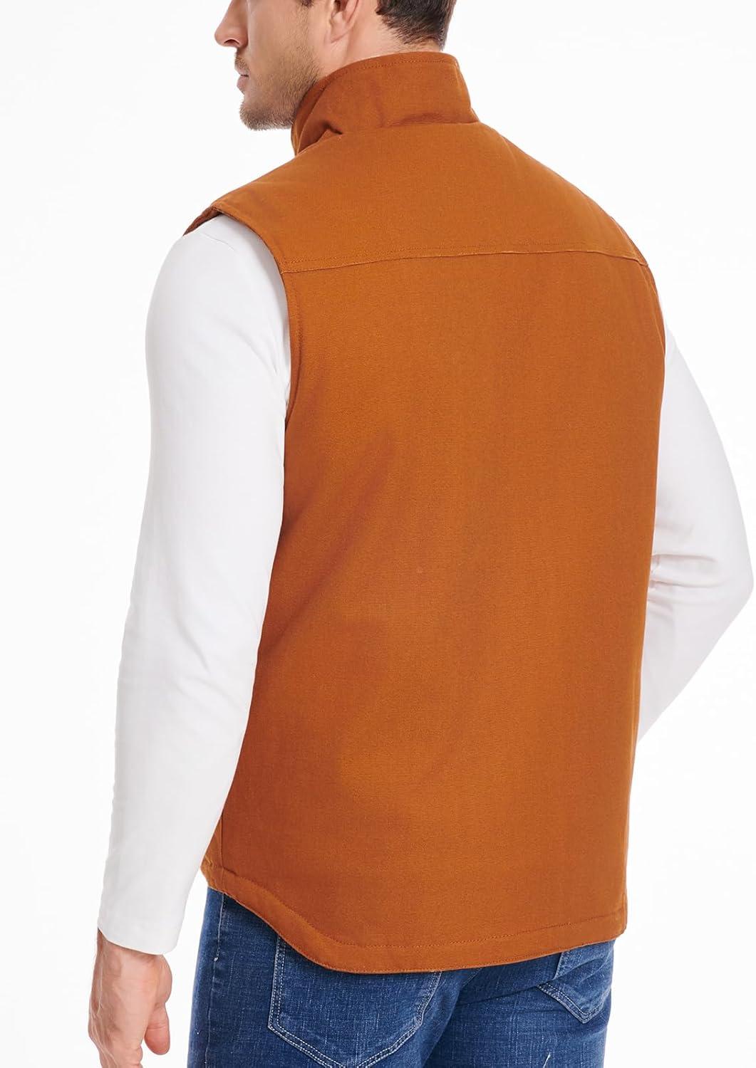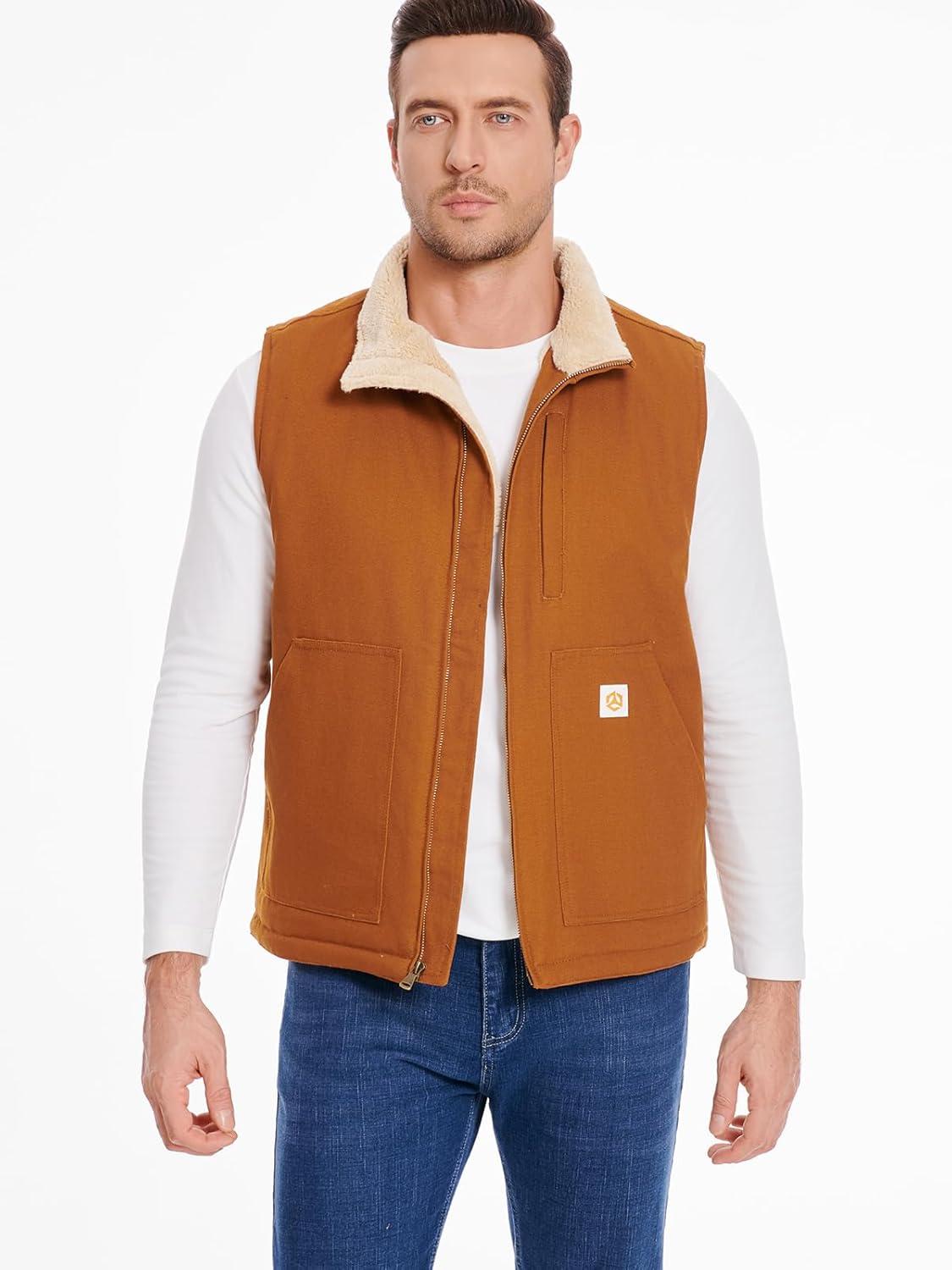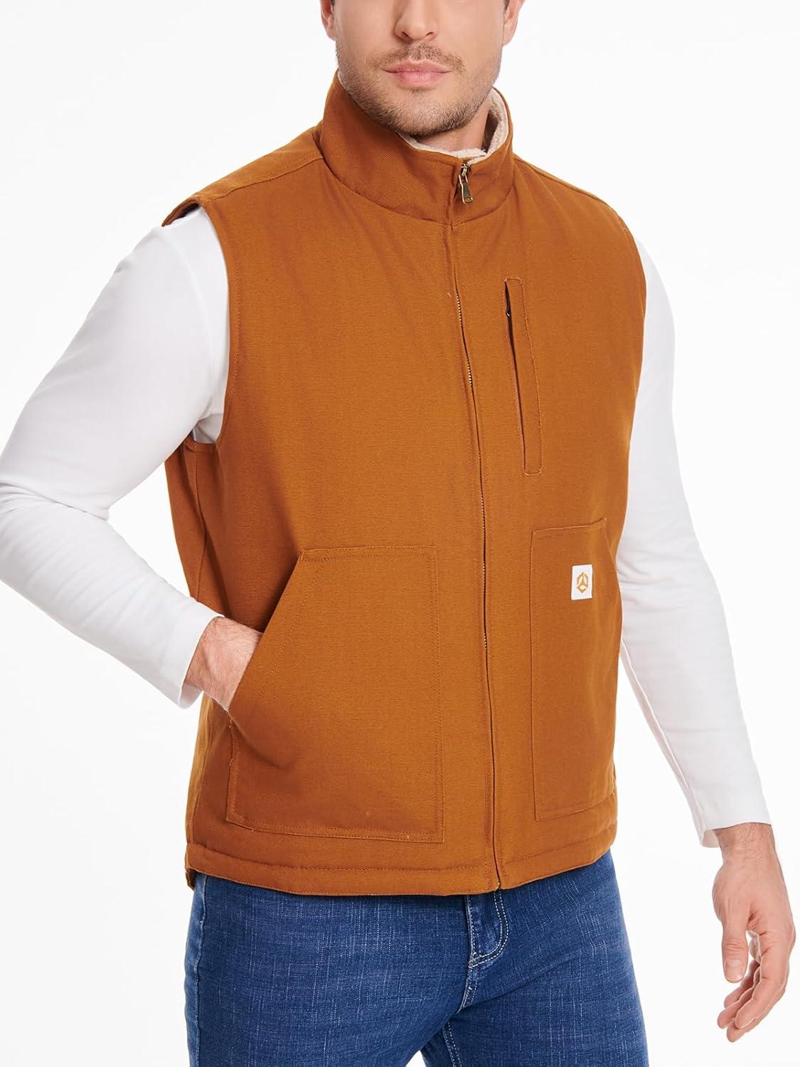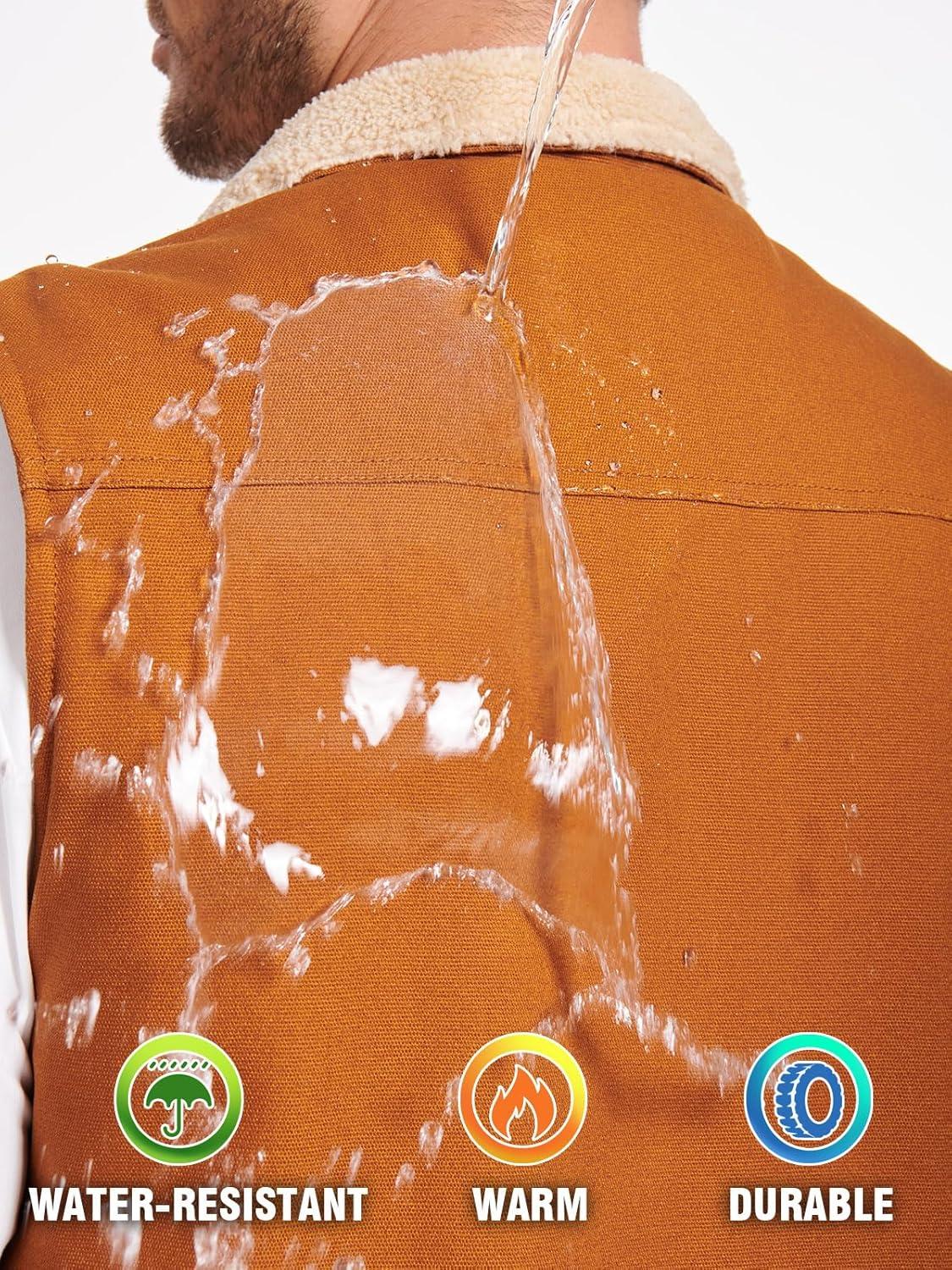 CARWORNIC Waterproof Washed Duck Vest Winter Sherpa Fleece Lined Loose Fit Mock-Neck Insulated Canvas Workwear Vest(Brown)